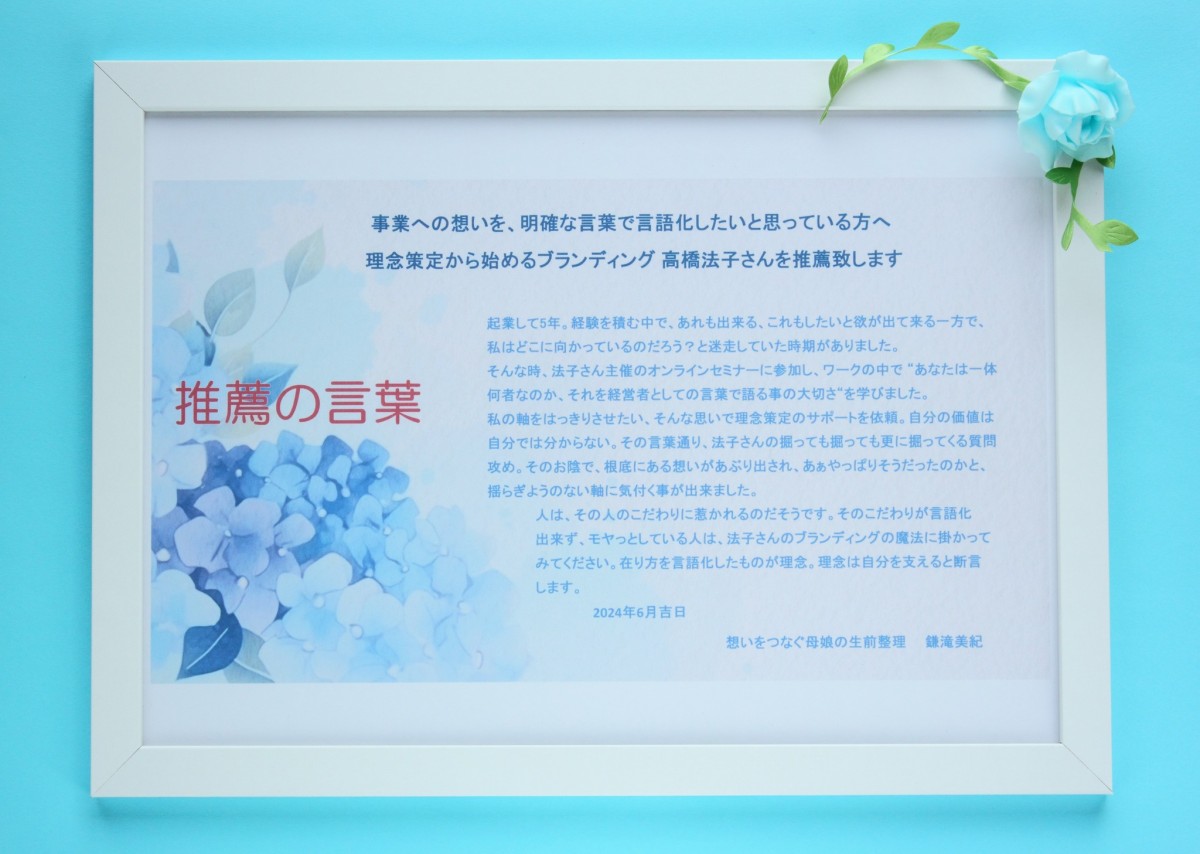 先日、とても素敵な「推薦の言葉」をいただきました。