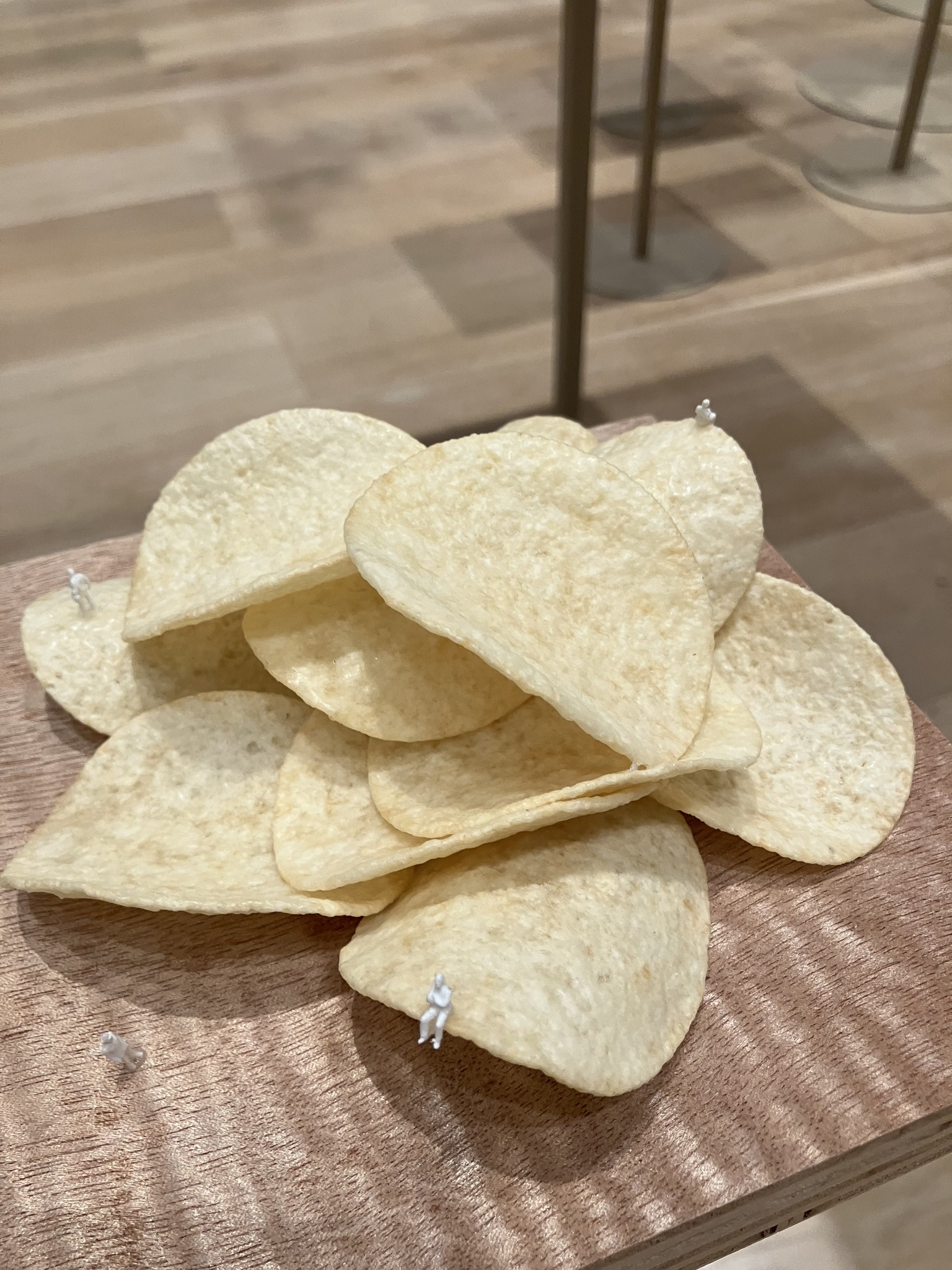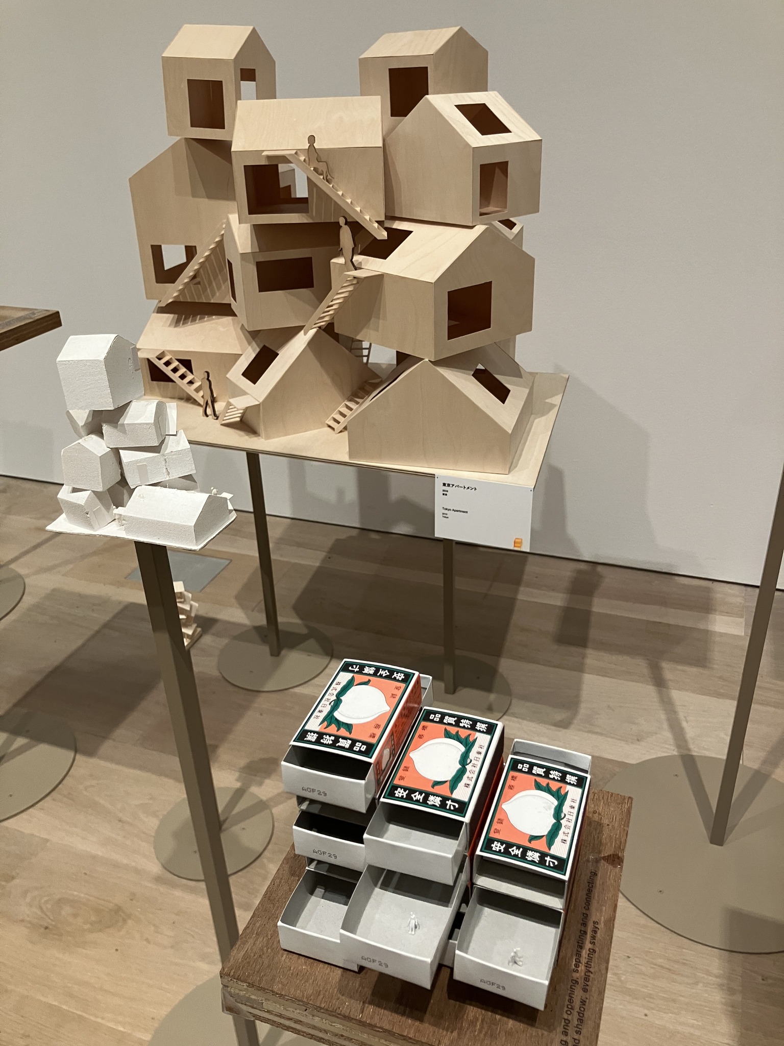 建築の発想の源となった素材とともに、マッチ箱や松ぼっくり、丸めた紙やポテトチップスまで、