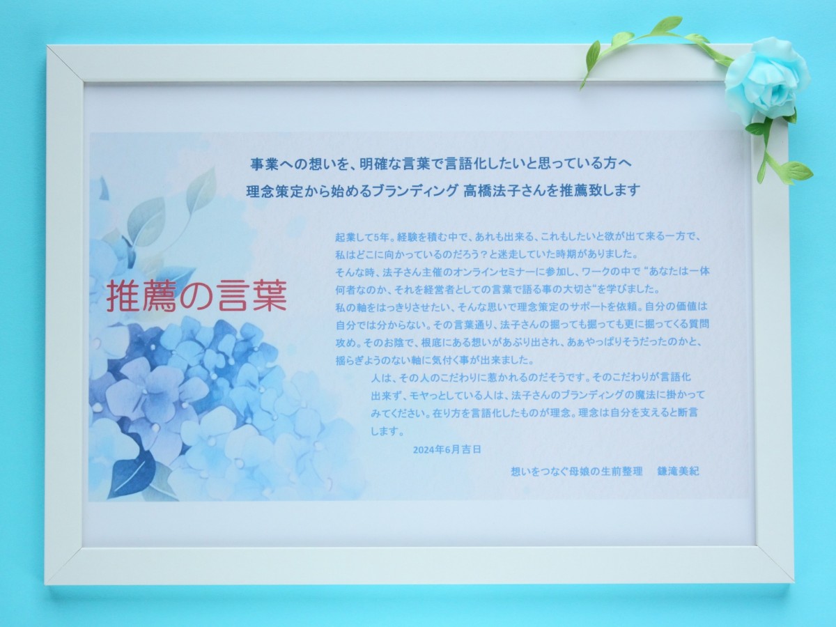 先日、とても素敵な「推薦の言葉」をいただきました。しかも、丁寧に額装されて届いたのです。 手に取った瞬間に胸がじんわりと熱くなりました。 デジタルでのやりとりが当たり前になり、 お手紙をいただく機会も少なくなった今だからこそ、 「紙」に込められた言葉は、 こんなにも心を動かすものだったと、 優しく思い出させ...